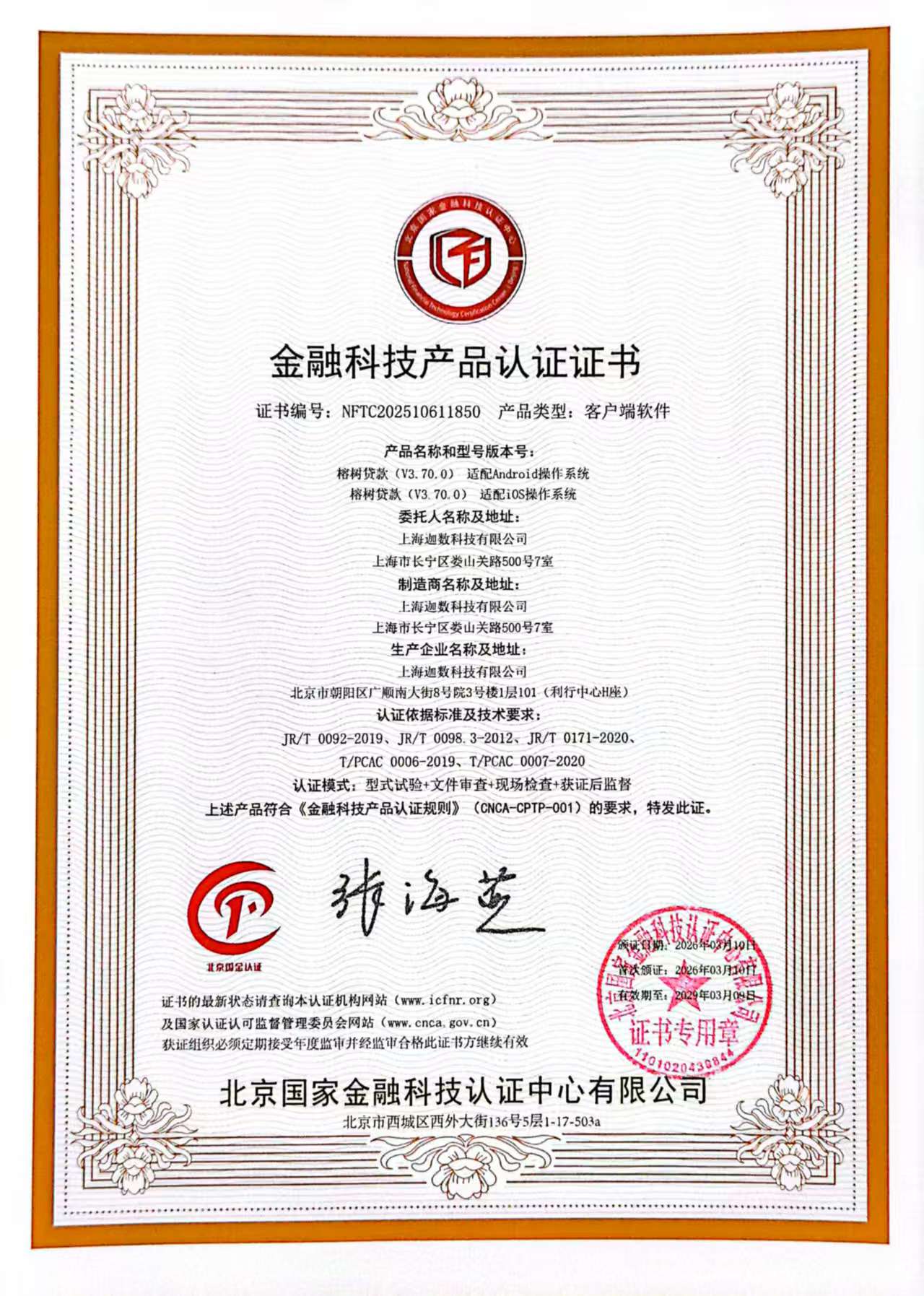 北京国家金融科技认证中心,是经国家市场监督管理总局与国家认监委联合批准设立的权威第三方认证机构。此次榕树贷款斩获的“金融科技产品认证证书”,是北京国家金融科技认证中心依据多项金融行业标准及技术规范,对平台展开全维度、系统化评估后的重磅认可。